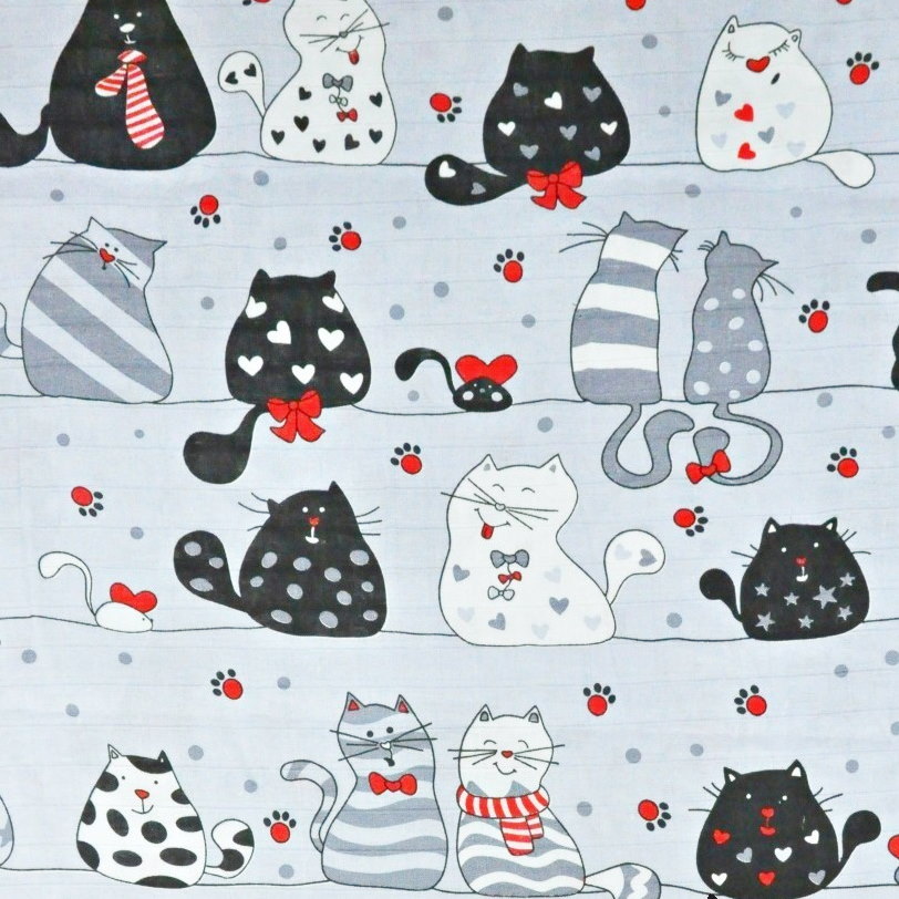 Bavlněná tetra mušelínová zavinovačka/osuška/deka 110x110cm PREMIUM - Šedá kočičkyVýrobek ušijeme a odešleme do 4-6 pracovních dní od zaplacení240 Kč/ ks