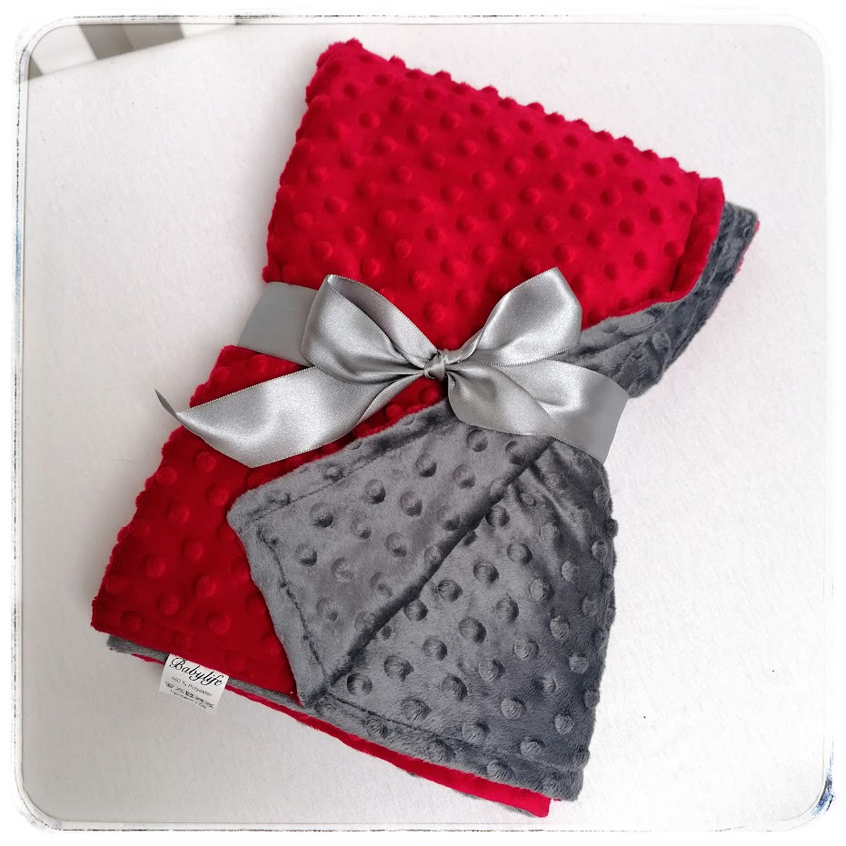 Velmi příjemná dvojitá deka z materiálu MINKY barva tmavě šedá a červená. Hebká, teplá a praktická deka použitelná do kočárku, autosedačky či postýlky.