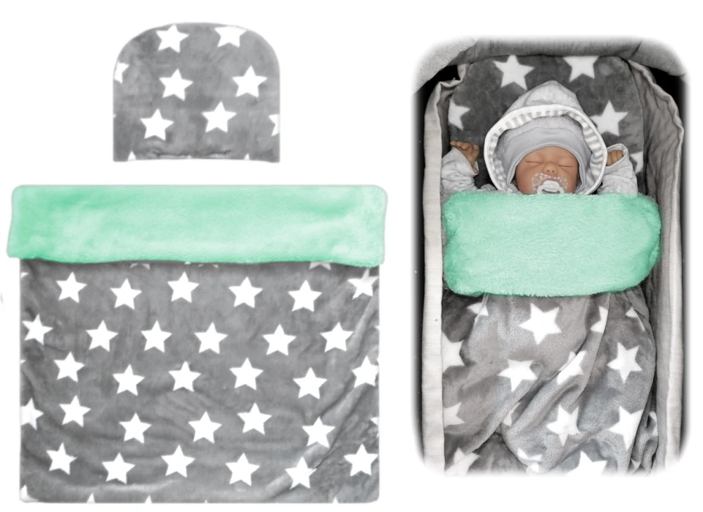 - Komplet do kočárku - VELVET bílé hvězdy na šedé/mintový