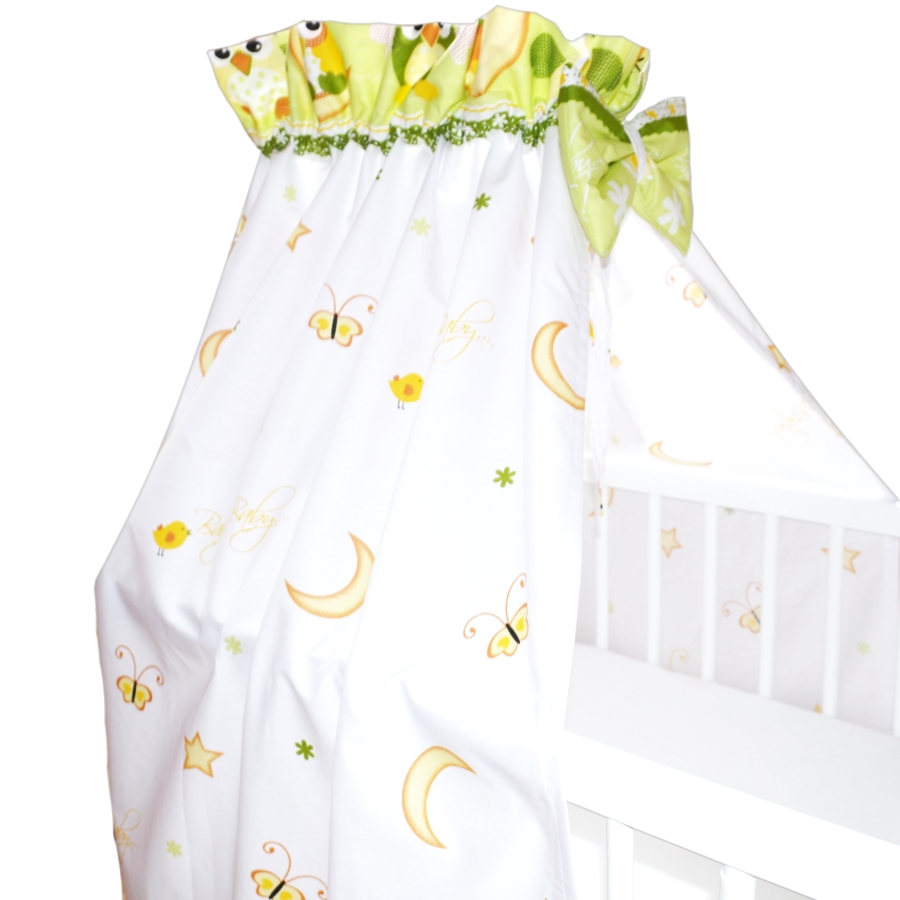 Bavlněná nebesa na postýlku s mašlí (100%BA). Design zelené sovičky na bílé.