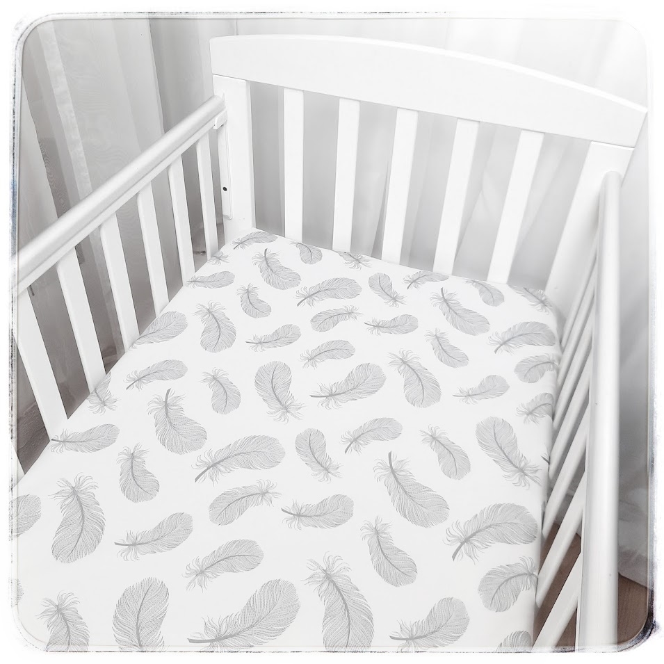 - Plátěné prostěradlo do postýlky 120x60 cm s gumičkou - Světle šedá pírka na bílé