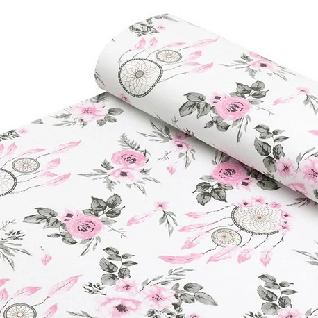 Klasické bavlněné plátno Lapače snů růžové na bílé.
