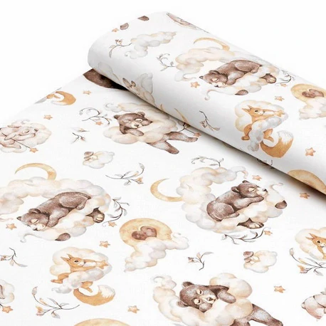 B114 - VZORNÍK - Bavlněné plátno klasik - Hnědí medvídci na obláčcíchSkladem/ ks