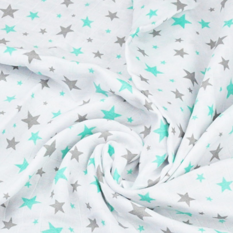 Bavlněná tetra mušelínová osuška 150x95cm - Mintové šedé hvězdičky na bíléVýrobek ušijeme a odešleme do 6-8 pracovních dní od zaplacení220 Kč/ ks