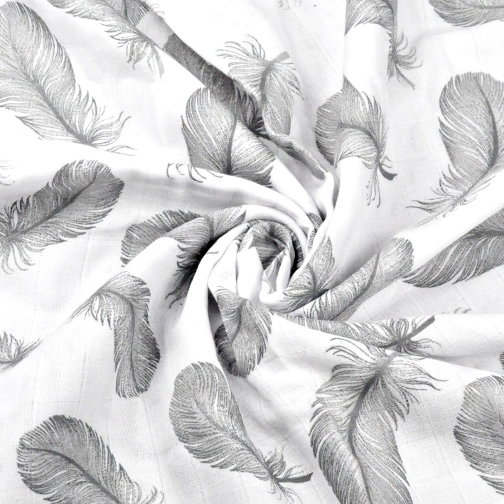 Bavlněná tetra mušelínová zavinovačka/osuška/deka 110x110cm PREMIUM - Šedá pírka na bíléVýrobek ušijeme a odešleme do 4-6 pracovních dní od zaplacení240 Kč/ ks