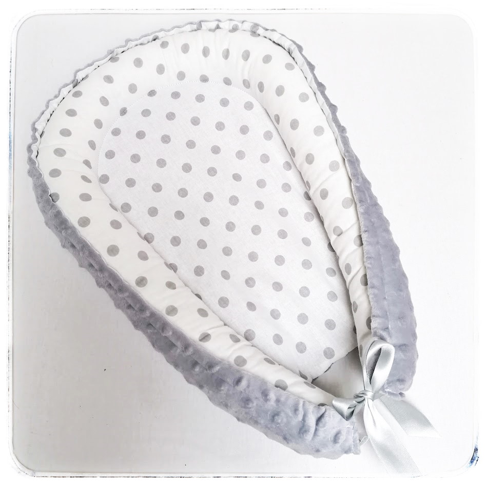 - Hnízdečko pro panenku do velikosti 35cm - světle šedé minky / BA potisk šedé puntíky