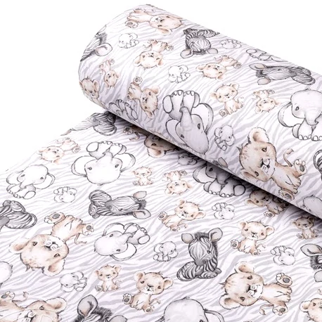 Metráž 100% bavlna plátno 10 cm - Zebry, lvíčci a sloníci (velké postavičky)
