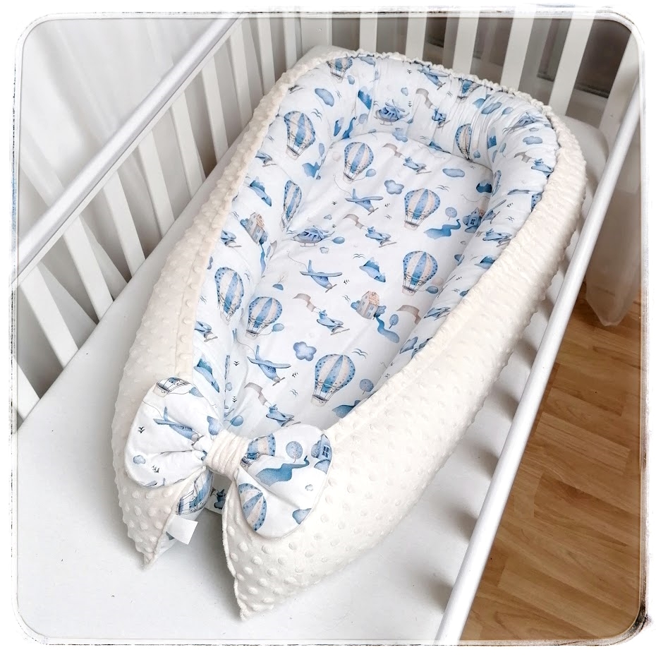 Oboustranné hnízdečko pro miminko do postýlky MINKY -MINKY smetanové Pristine/bavlna Modrá letadla a balónyVýrobek ušijeme a odešleme do 1-2 týdnů od zaplacení1 050 Kč/ ks