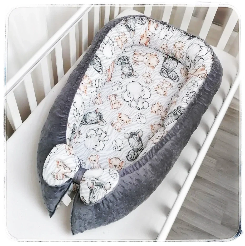 Oboustranné hnízdečko pro miminko do postýlky MINKY - MINKY tmavě šedé/bavlna Zebry, lvíčci a sloníci (velké postavičky)Výrobek ušijeme a odešleme do 1-2 týdnů od zaplacení1 050 Kč/ ks